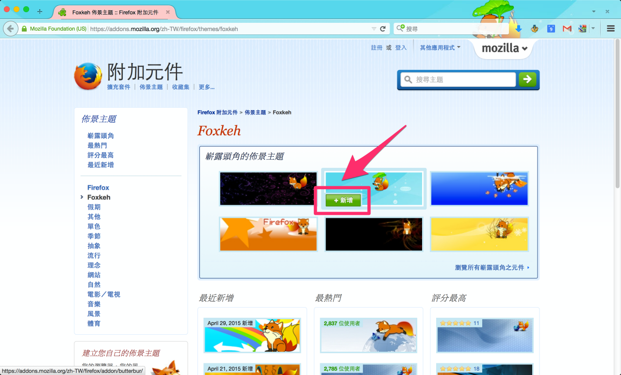 如果確定要加到 Firefox 裡,當滑鼠在該主題的圖片上方時,圖片的左下角會有「新增」的按鈕,點選它就會開始安裝了。